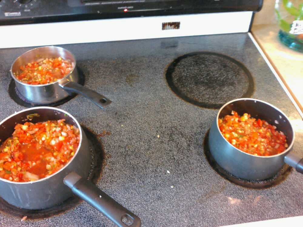 We attempted to make three batches...one mild for the kids, one medium for us in case we didn't like the third, hot with jalapenos, but in our attempt to turn down the back burner with the hot salsa, we turned down the front burner instead which led to the burning of our hot batch. Other than that it went quite smoothly. We are proud salsa makers!