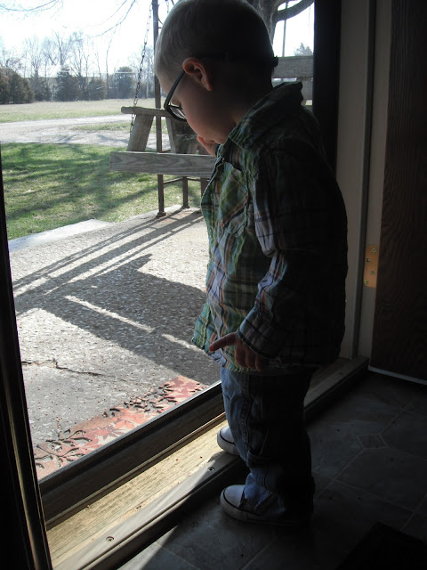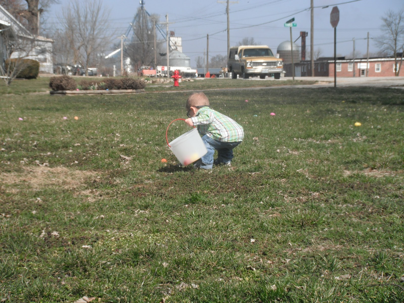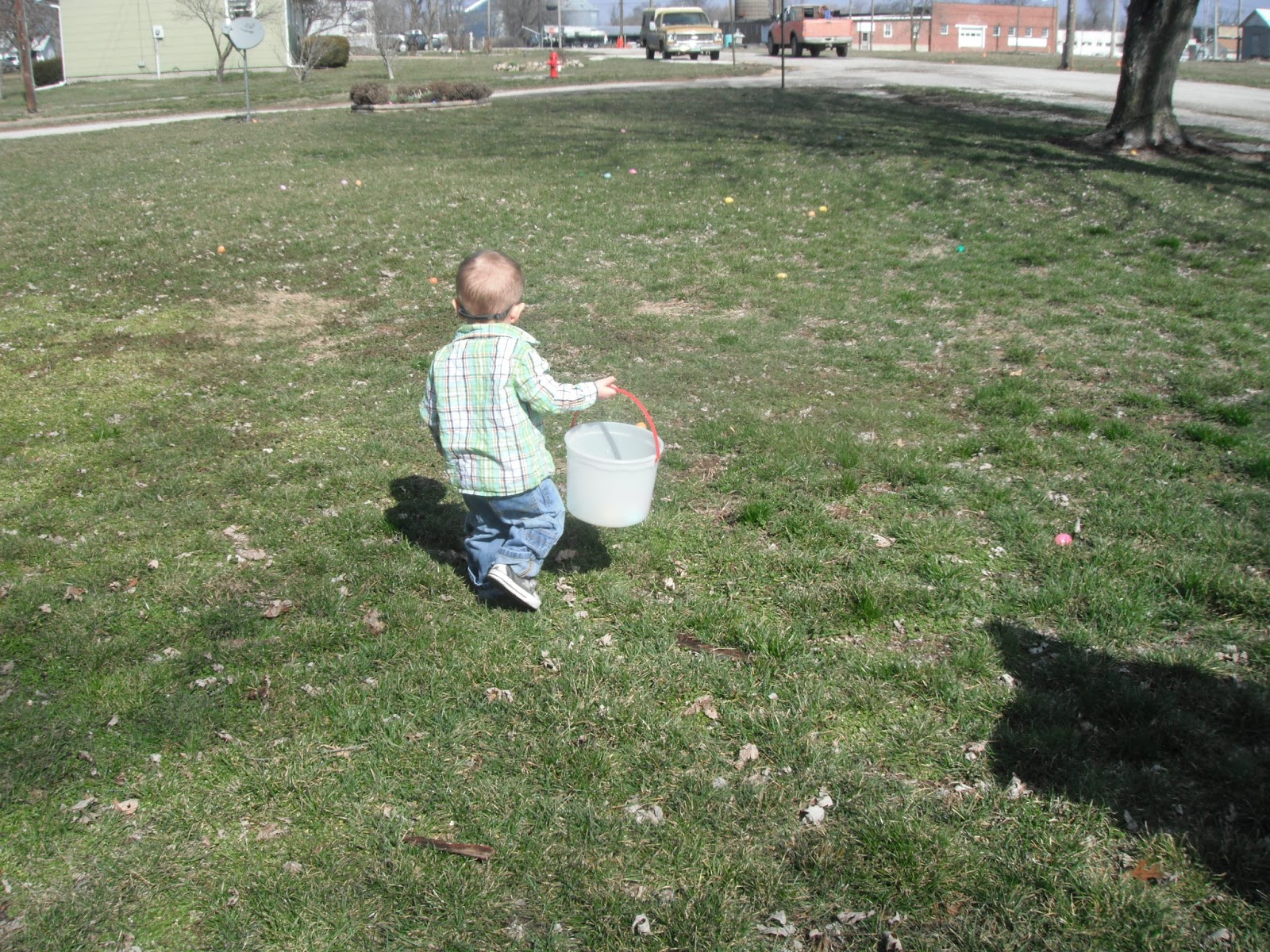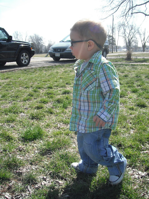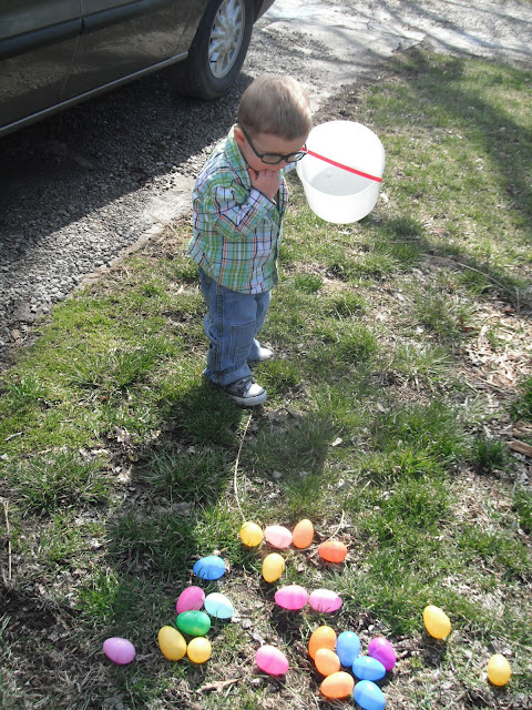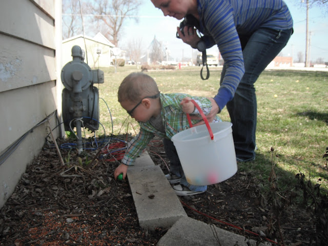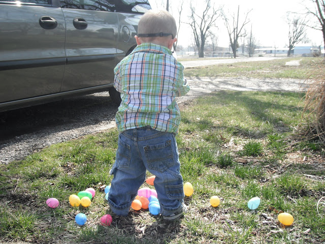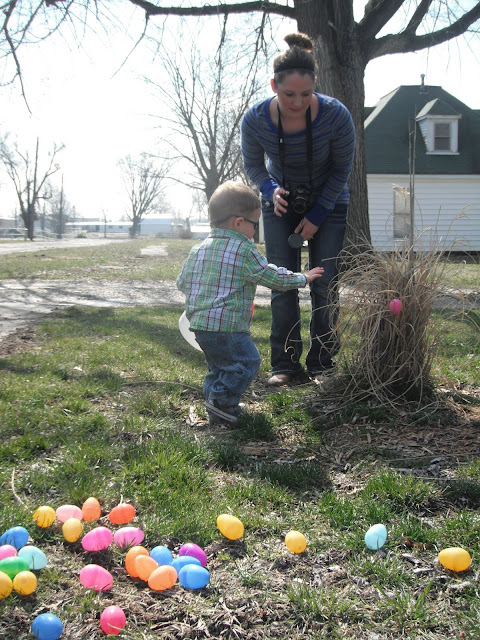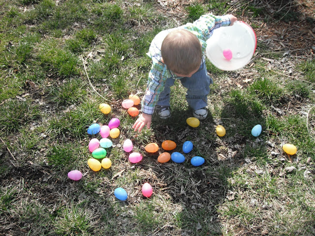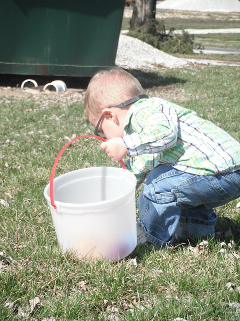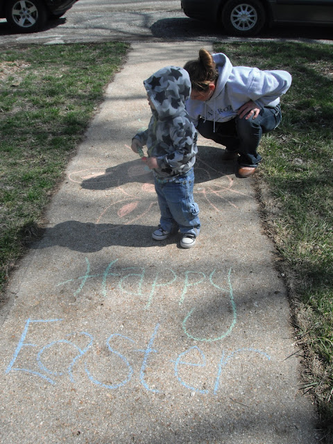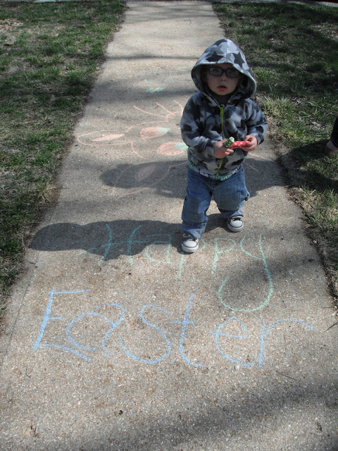 McCoy was able to have an outdoor Easter egg hunt on Easter Sunday. He was the perfect age for it. He'd point to an egg laying in the grass and run to put it in his basket. He almost had his basket full and was obviously seeing the eggs in which we pointed out, but his desire to grab and collect them had gone cold. Instead, he dumped the eggs from his basket onto the grass, and moved on to the next fun thing he could find to occupy himself with. We played with chalk on the sidewalk and when I say "we," I mean Kimberly and I, because McCoy only wanted to hold all four pieces rather than share or color with them.