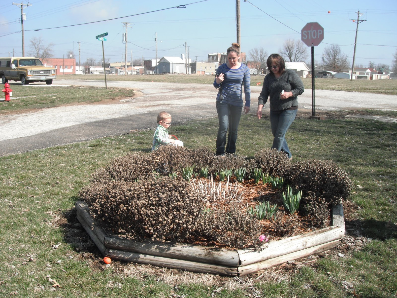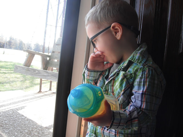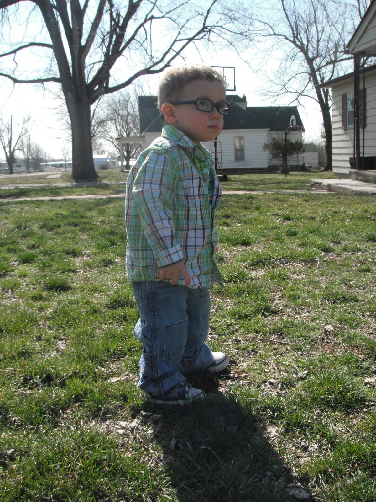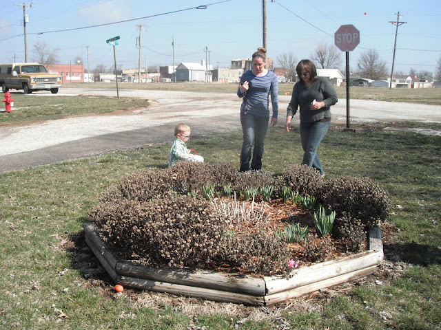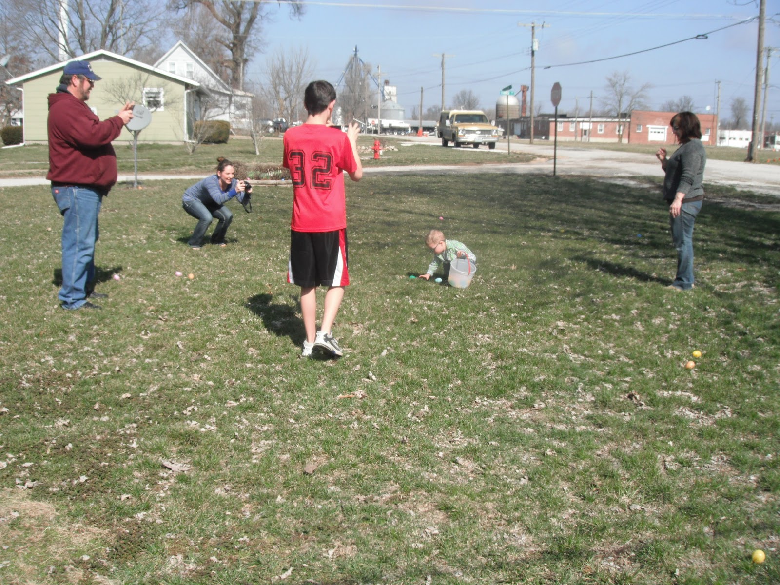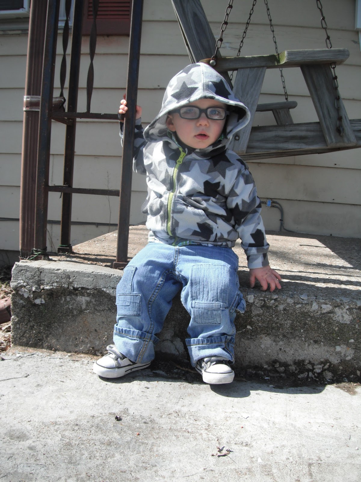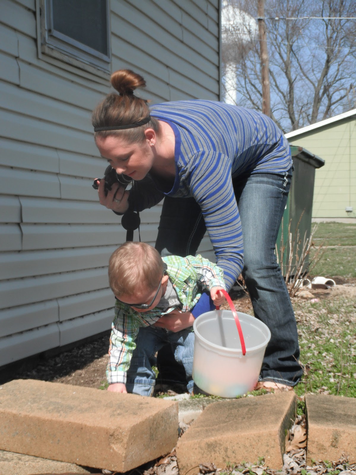 McCoy was able to have an outdoor Easter egg hunt on Easter Sunday. He was the perfect age for it. He'd point to an egg laying in the grass and run to put it in his basket. He almost had his basket full and was obviously seeing the eggs in which we pointed out, but his desire to grab and collect them had gone cold. Instead, he dumped the eggs from his basket onto the grass, and moved on to the next fun thing he could find to occupy himself with. We played with chalk on the sidewalk and when I say "we," I mean Kimberly and I, because McCoy only wanted to hold all four pieces rather than share or color with them.