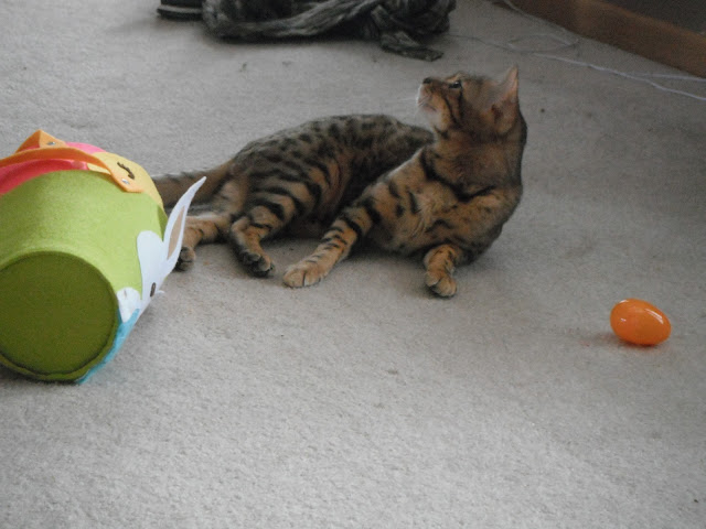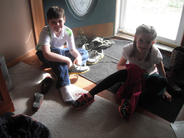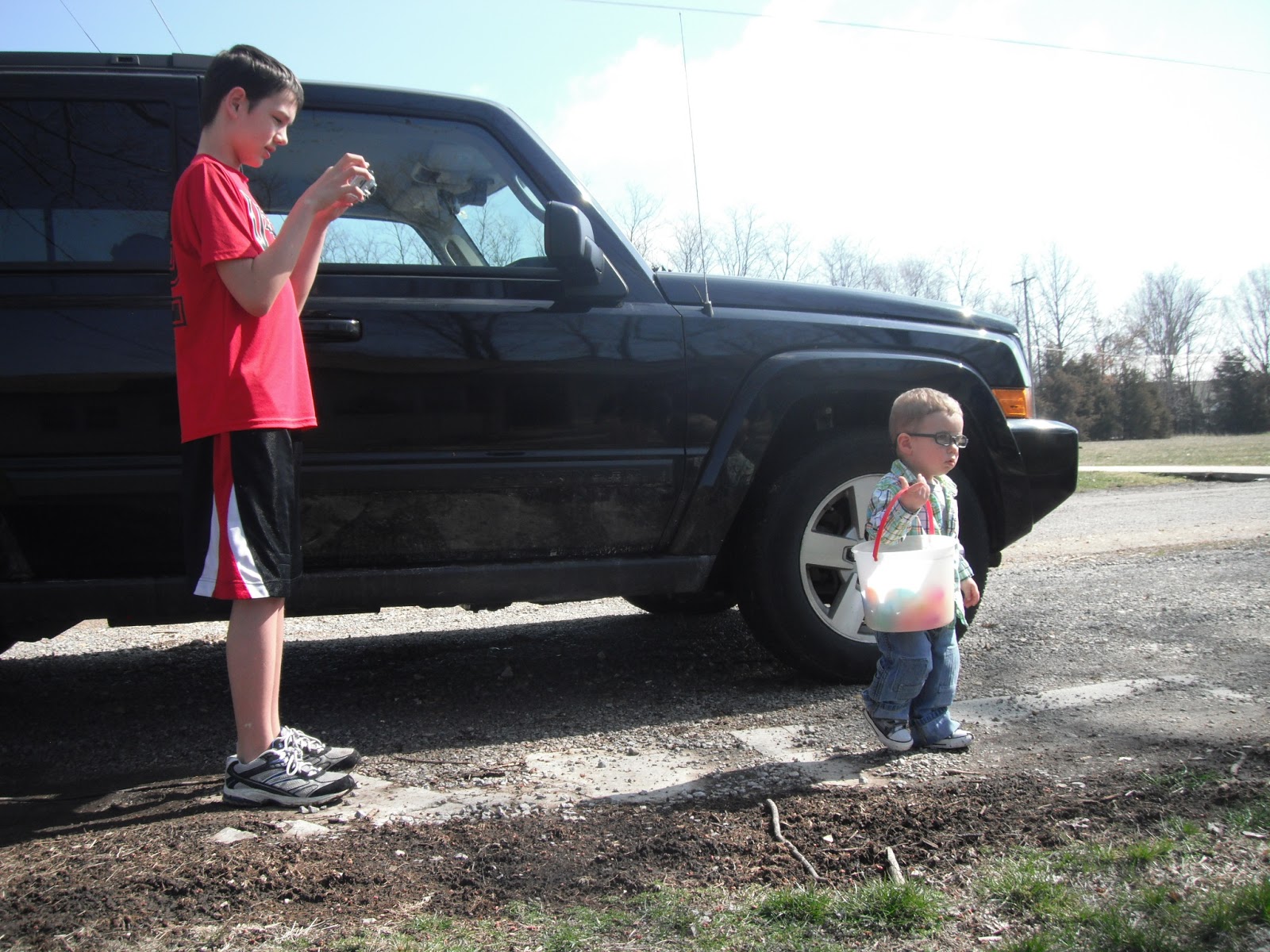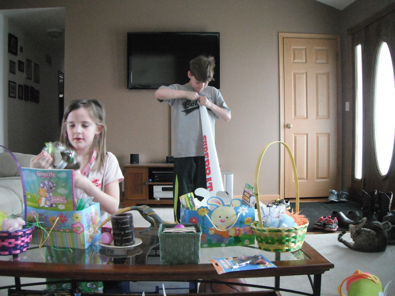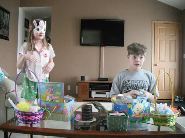 When we woke up Sunday morning, the Easter bunny had visited our house and left a jelly bean trail from the kids' beds into the living room to their Easter baskets and new sports items which included a basketball for Kaden, baseball for Kylie, and rubber baseball plates for both.