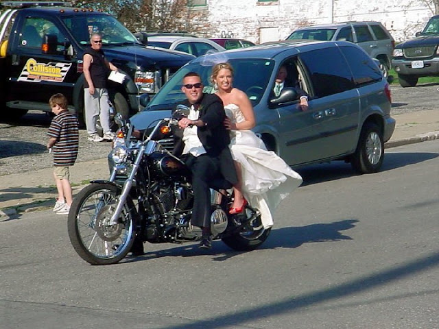 Today is the anniversary of one of the people who mean the most to me. Happy 3rd anniversary to my sister and her husband. This is the first anniversary that the two of them can be together to celebrate as the past two years they were apart due to Lonnie's deployment and my sister's job in North Dakota. In these past three years, they have grown their family by one special little boy. I remember this day three years ago so vividly. It was a beautiful sunny day, with a slight breeze that was perfectly cooling. The wedding was beautiful, and perfect, and perfectly played out. My best friend (and cousin) sang a song while her boyfriend at the time (who has since left this Earth) played the guitar. My sister was the most beautiful bride and I will never forget the way it made me feel to watch her and my father walk up the isle on her special, special day. They rode off on Lonnie's motorcycle which was probably my favorite part of the whole wedding. My mother made the beautiful wedding cake which resembled Kimberly's wedding dress. We danced the night away and had a wonderful gathering in the morning for breakfast with the whole family. There's a photo below of Kimberly and Lonnie on their bike and there's a tow truck in the background. This is a funny story that involves Keane having to use one of Kimberly's bridesmaid's AAA hook-up to unlock a running vehicle during the ceremony.