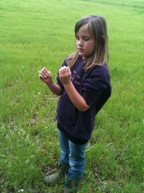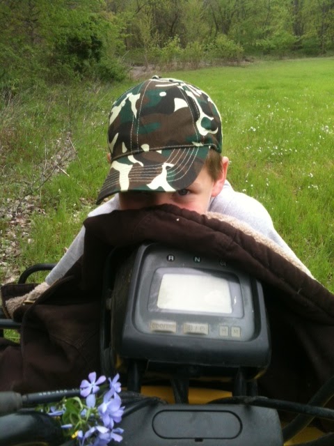 On Sunday, the four of us found room on the fourwheeler, with Kylie sitting on her booster seat in the back, and made our way to the same woods as the boys did the day prior. While we were walking, Keane whispered something to Kaden and he wandered off a different direction. When he met back up with us, he handed me and Kylie some purple wild flowers. "Girls always like flowers, son. Especially wild ones." It started raining before we were finished with our search. We ran out and quickly rode home in the rain, carrying a bag with 31 mushrooms.